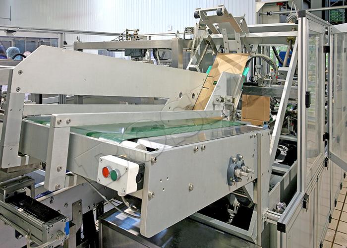 該系統主要為客戶解決紙盒牛奶的輸送、裝箱、碼垛問題。最大生產能力每小時840箱(24盒/箱); 牛奶裝箱系統包含: 1、夾包輸送機 2、撥桿分料器 3、編組滑道 4、編組輸送機推包機 5、自動裝箱機